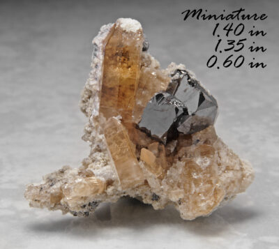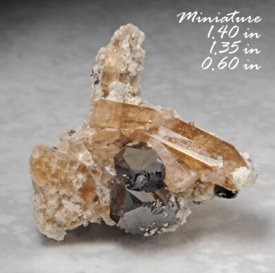 Bixbyite & Gem Pink Topaz – Location: Thomas Range, Juab Co., Utah. This is from the Solar Wind claim that we (topazminer) own and operate and have been developing over the last few years. Here we have an interesting combination. We have some bixbyite crystals with some small gemmy pink topaz crystals perched on the bixbyite. The topaz crystals are small but well-formed and gemmy with a pale amber color. The bixbyite crystals have a brilliant black metallic luster and are highly modified. Note! The topaz crystals from this location are unusual in that they are “not” light sensitive. The topaz crystals start out the same as the other topaz from the Thomas Range, as sherry colored crystals. After direct exposure to the sun for a week or so the sherry color fades away revealing the ?true? pale rose pink color of the crystals. The color is there from the start, it is just ?masked? by the radiation induced sherry color. Trace amounts of manganese (Mn) are responsible for the pink color. The pink color is completely stable! The topaz crystals pictured here have not yet undergone the ?color change? to pink and as such shows the ?usual? amber color that the topaz have when they are found in previously unexposed cavities.