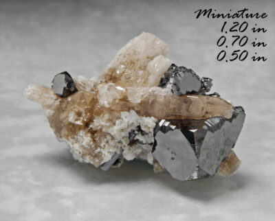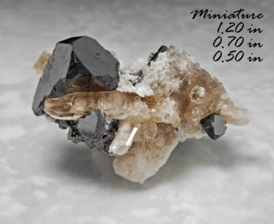 Bixbyite & Gem Pink Topaz – Location: Thomas Range, Juab Co., Utah. This is from the Solar Wind claim that we (topazminer) own and operate and have been developing over the last few years. Here we have an interesting combination. We have some bixbyite crystals with some small gemmy pink topaz crystals perched on the bixbyite. The topaz crystals are small but well-formed and gemmy with a pale amber color. The bixbyite crystals have a brilliant black metallic luster and are highly modified. Note! The topaz crystals from this location are unusual in that they are “not” light sensitive. The topaz crystals start out the same as the other topaz from the Thomas Range, as sherry colored crystals. After direct exposure to the sun for a week or so the sherry color fades away revealing the ?true? pale rose pink color of the crystals. The color is there from the start, it is just ?masked? by the radiation induced sherry color. Trace amounts of manganese (Mn) are responsible for the pink color. The pink color is completely stable! The topaz crystals pictured here have not yet undergone the ?color change? to pink and as such shows the ?usual? amber color that the topaz have when they are found in previously unexposed cavities.