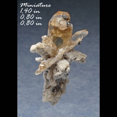 Gem Topaz & Pseudobrookite (Direct Mine source) – Location: Thomas Range Juab Co. Utah. Miniature (see photo for more details). Here we have a nice cluster of amber sherry colored topaz crystals along with a few small needle-like crystals of the iron titanium oxide mineral pseudobrookite from a relatively new topaz locality in the Thomas Range that we as topazminer own and operate in the Thomas Range in western Utah. Here we have an aesthetic cluster of gemmy topaz crystals that are well-formed sharp and have a beautiful amber sherry color along with a glassy luster. The crystals are of gem quality. There are some black colored stubby needle-like crystals of pseudobrookite perched on some of the topaz. The crystals are a black color with a bright metallic luster.