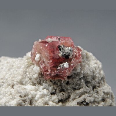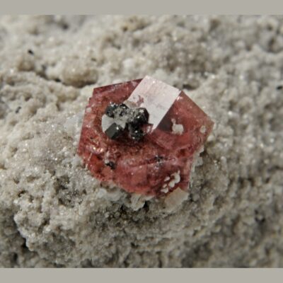 Red Beryl & Bixbyite on Volcanic Rhyolite Matrix – Location: Thomas Range (Topaz Mountain), Juab Co., Utah. Thumbnail (see photo for more details). When it comes to red beryl, Utah is the “place”. Red beryl was first discovered and described by Maynard Bixby from the Thomas Range (type locality) in the late 1890s. By the way, Maynard Bixby also first discovered and described bixbyite from this same locale. Here we have a very rare combination of these two rare and unusual minerals. We (topazminer) collected this very unique specimen from one of the many claims that we own and operate in the Thomas Range. First let me just say that the combination of these two minerals (on the same specimen) is extremely rare. They are perched on beautiful rhyolite volcanic matrix. The color is a raspberry pink color and even though it is not suitable for a cut gemstone it does have some gemmy areas. There are some small bixbyite cubes (unmodified) growing on the surface of the red beryl.