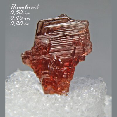 Garnet Var. Spessartine – Location: Navegadora Mine Conselheiro Pena Minas Gerais Brazil. Thumbnail (see photo for more details). Here we have a most unusual and attractive specimen of bright gemmy red spessartine garnet. The garnet is a complete crystal that has a somewhat tabular habit and shows multiple faces that are oriented in a somewhat parallel growth. The crystal is otherwise well-formed and sharp and has a beautiful red color and is gemmy and has a bright glassy luster. This is a most unusual habit for this species of garnet.